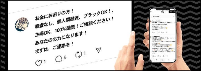 最近では、SNSを利用した「#個人間融資」「後払い(ツケ払い)現金化」「先払い買取」といった新しいタイプのヤミ金が主流になっています。